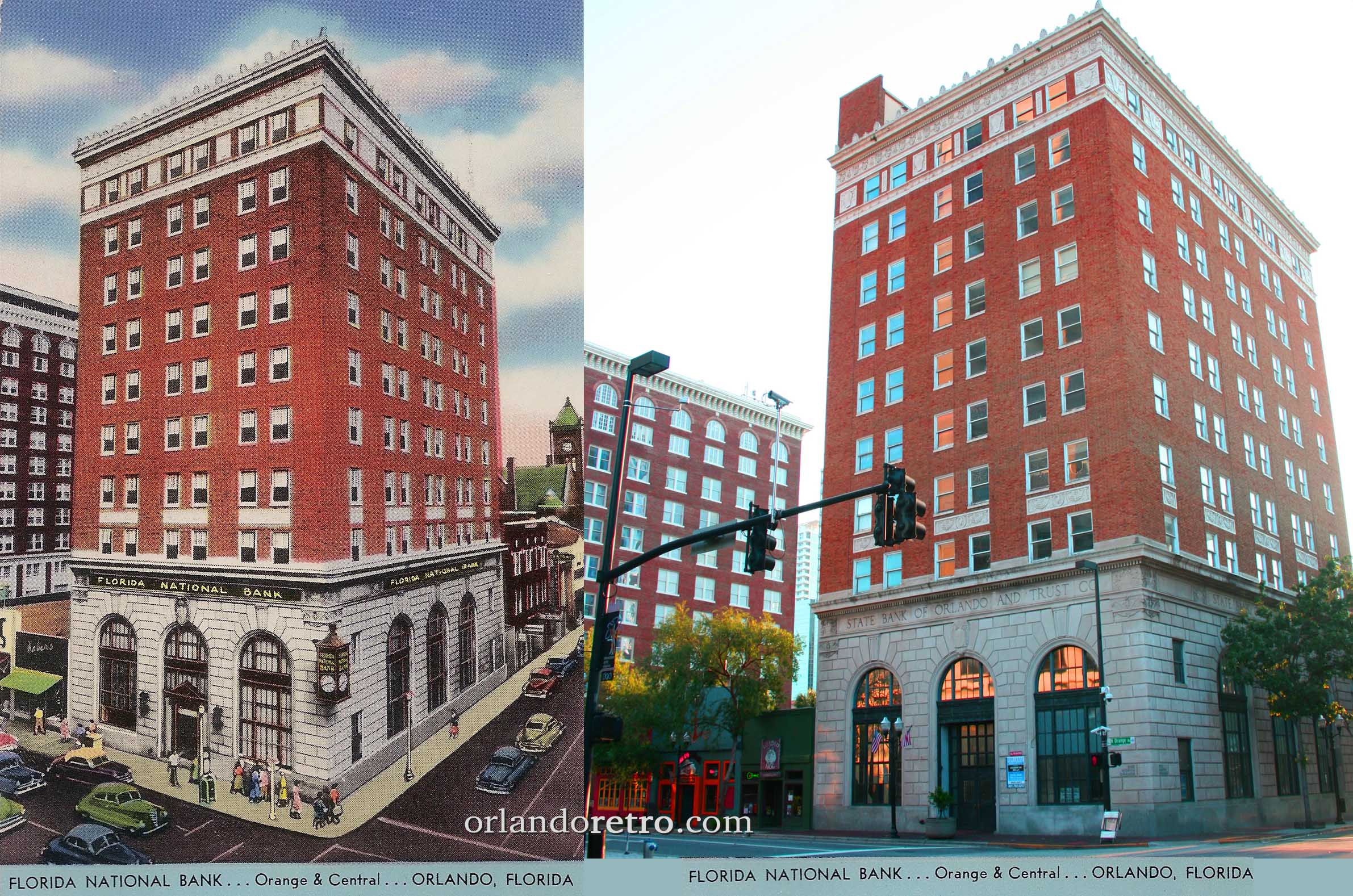 Left:  After 1930, Florida National Bank operated a 1 North Orange Ave. Right:  Today the original State Bank of Orlando and Trust Company is visible.