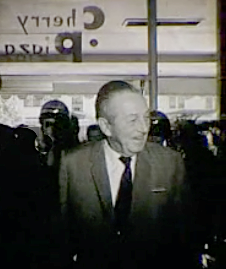 Walt Disney walking into the Cherry Plaza to make an announcement that would forever change Orlando.